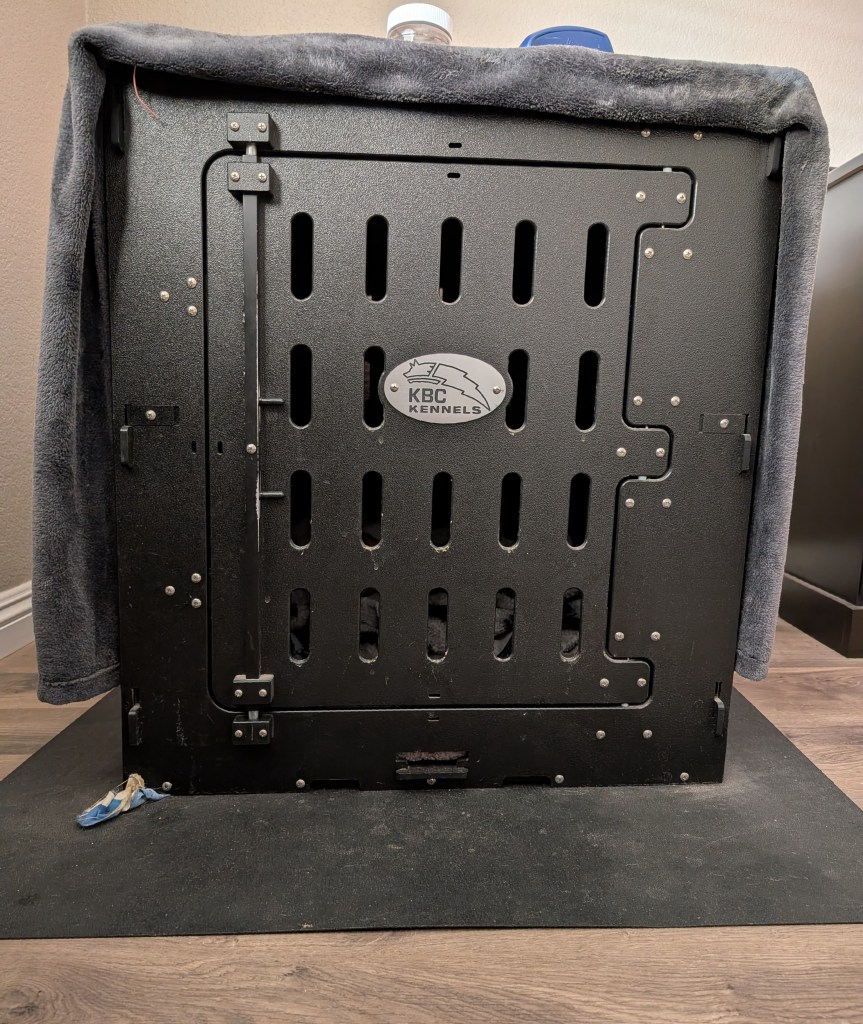 My husband immediately researched safer crates that had enough airflow, were not made of metal, but strong and could hopefully keep our dog safe while we weren’t home. He ended up finding KBC Kennels and we did not have to continue our search after that. The crate is made of hard plastic, has plenty of holes, but the design doesn’t allow him to chew on them. They have standard crates and “breakdown” crates. We chose the breakdown kennel so that we could travel with it if needed.
