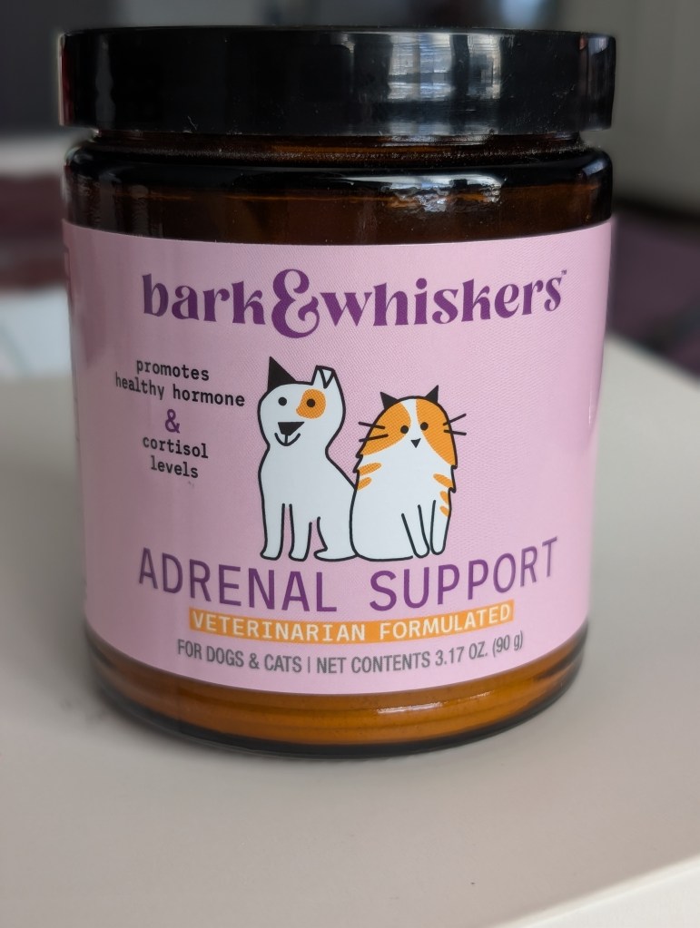 I decided it was time to start up my research for an affordable ashwagandha supplement for him. I found Bark & Whiskers Adrenal support through Google. They weren’t too expensive and it came in a powder form that I could add to King’s kibble. The jar lasts a good two months for King who is around 55lbs currently.